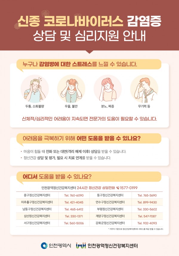 신종 코로나바이러스감염증 심리지원 안내 페이지 정보 작성자 부평중독 댓글 0건 조회 9,312회 작성일 20-02-06 10:42 목록 본문 신종 코로나바이러스감염증 상담 및 심리지원 안내입니다. 참고하시길 바랍니다. 이전글희망나래공동체 잠정적 연기 안내 20.02.10 다음글신종코로나바이러스 관련 공지(예방수칙) 20.02.06 댓글 0 댓글목록 등록된 댓글이 없습니다.