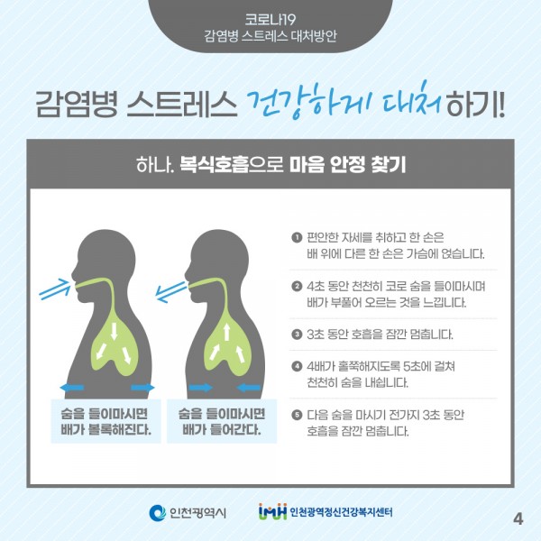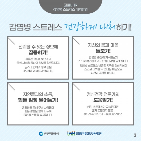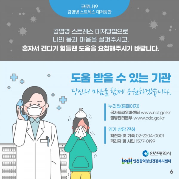 감염병 스트레스 대처방법으로 나의 몸과 마음을 살펴주시고, 혼자서 견디기 힘들땐 도움을 요청해주시기 바랍니다.