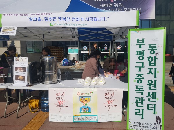 부평구 중독관리통합지원센터에서는 음주폐해예방의 달을 맞이하여 2017행복부평 나눔장터에 참여하여 “알코올 멈추면, 행복한 변화가 시작됩니다.”라는 주제를 가지고 이동상담 및 캠페인을 실시하였습니다.