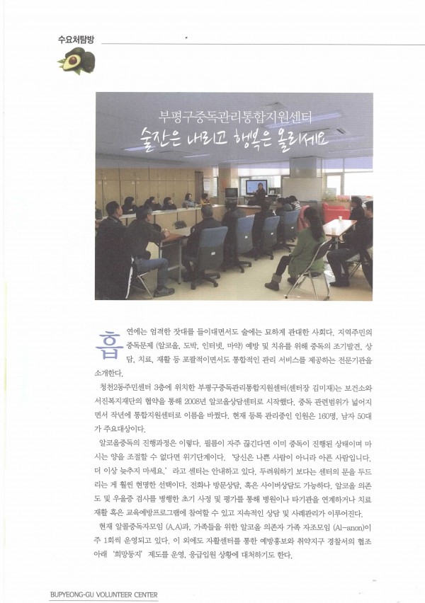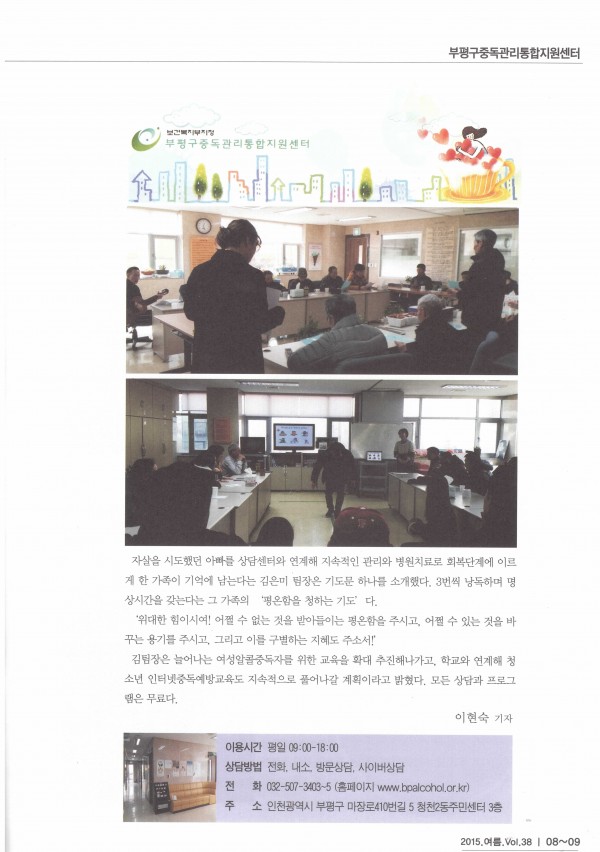 부평구중독센터 홍보글 게시 페이지 정보 작성자 부평알상 댓글 0건 조회 8,396회 작성일 15-07-17 11:33 목록 본문 부평구자원봉사센터 2015.여름/Vol.38호에 부평구 중독관리통합지원센터 관련글이 게시되었습니다. 이전글사회복지 실습생 기관방문 15.07.17 다음글여가프로그램 실시[삼계탕만들기] 15.07.17 댓글 0 댓글목록 등록된 댓글이 없습니다.
