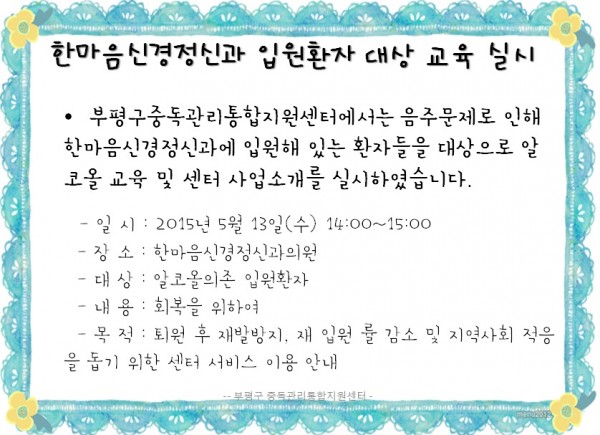 부평구중독관리통합지원센터는 음주문제로 인해 한마음신경정신과에 입원해 있는 환자들을 대상으로 알코올 교육 및 센터 사업소개를 실시하였습니다.
