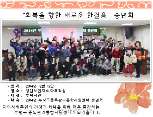 부평구중독관리통합지원센터 "회복을 향한 송년회" 페이지 정보 작성자 부평알상 댓글 0건 조회 7,758회 작성일 14-12-15 11:45 목록 본문 부평구중독관리통합지원센터 "회복을 향한 송년회" 가 진행되었습니다. 이전글삼산-갈산 정신건강협의체 희망둥지 협약식 14.12.15 다음글12월 이동상담 일정입니다. 14.12.15 댓글 0 댓글목록 등록된 댓글이 없습니다.