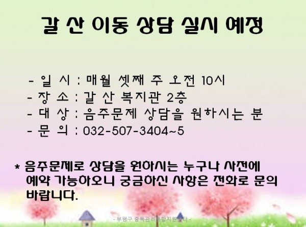 갈산동 이동상담 일정입니다. 페이지 정보 작성자 부평알상 댓글 0건 조회 7,671회 작성일 15-01-26 15:17 목록 본문 1월 이동상담 일정은 1월 20일 입니다. 이전글여성알코올 교육 일정입니다. 15.01.26 다음글삼산동 이동상담 일정입니다 15.01.26 댓글 0 댓글목록 등록된 댓글이 없습니다.
