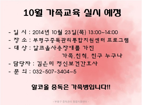10월 가족교육 일정안내 페이지 정보 작성자 부평알상 댓글 0건 조회 7,573회 작성일 14-10-10 16:16 목록 본문 10월 가족교육 일정안내입니다. 이전글10월 삼산복지관 이동상담 일정안내 14.10.10 다음글PTSD에 대한 이해와 접근교육 참여 14.09.25 댓글 0 댓글목록 등록된 댓글이 없습니다.