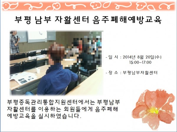 부평 남부 자활센터 음주폐해예방교육 페이지 정보 작성자 부평알상 댓글 0건 조회 7,993회 작성일 14-08-27 09:45 목록 본문 부평 남부 자활센터 음주폐해예방교육를 다음과 같이 진행하였습니다. 이전글2014년 중독관리통합지원센터 전환지원교육참여 14.08.27 다음글중독전문가 실습 14.08.27 댓글 0 댓글목록 등록된 댓글이 없습니다.