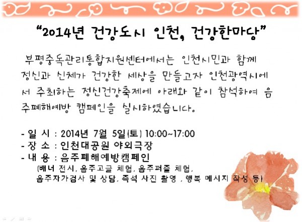 부평중독관리통합지원센터에서는 인천시민과 함께 정신과 신체가 건강한 세상을 만들고자 인천광역시에서 주최하는 정신건강축제에 아래와 같이 참석하여 음주폐해예방 캠페인을 실시하였습니다.