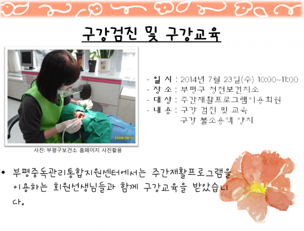 구강검진 및 교육 페이지 정보 작성자 부평알상 댓글 0건 조회 8,883회 작성일 14-07-24 10:48 목록 본문 부평중독관리통합지원센터에서는 주간재활프로그램을 이용하는 회원선생님들과 함께 구강교육을 받았습니다. 이전글단주 격려파티 14.08.07 다음글징검다리 A.A 10주년 공개모임 참여 14.07.24 댓글 0 댓글목록 등록된 댓글이 없습니다.