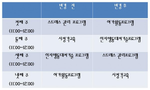 기관의 부득이한 사정으로 4월 금요일 (11시~12시) 주간재활프로그램일정이 변경되었습니다.