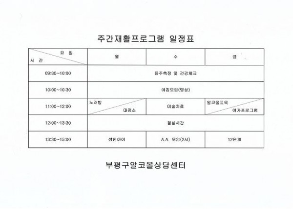 부평구알코올상담센터에서는 알코올중독으로 어려움을 겪고 있는 분들이 단주를 유지하여 온전한 회복의 길을 갈 수 있도록 돕고자 주 3회(월, 수, 금) 주간재활 프로그램을 실시하고 있습니다.  만족도 조사와 평가를 거쳐 2014년 주간재활 프로그램을 조정하였으니 참고하시어 많은 참석 바랍니다.