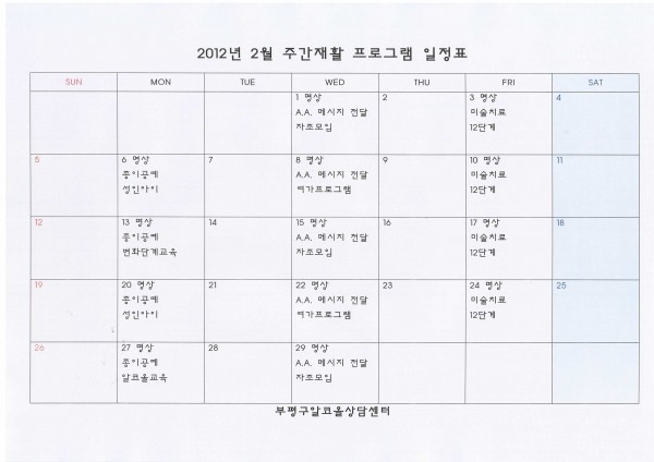 2월 주간재활 프로그램 일정 안내 페이지 정보 작성자 부평알상 댓글 0건 조회 7,888회 작성일 12-02-03 17:17 목록 본문 프로그램 참석을 원하시는 분은 참석여부에 대해 센터 담당자들과 상의한 후 결정하실 수 있습니다 ^^ 이전글여가프로그램 실시(영화감상) 12.02.09 다음글글로리병원 입원 환자 센터 내소 12.01.30 댓글 0 댓글목록 등록된 댓글이 없습니다.