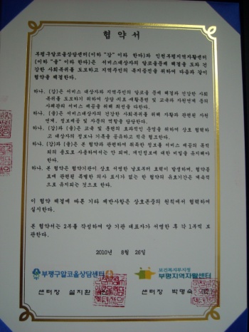 부평구알코올상담센터에서는 인천부평지역자활센터와 사업연계협약을 체결하였습니다.