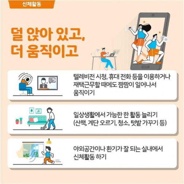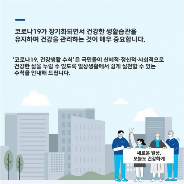 보건복지부와 한국건강증진개발원은 코로나19 장기화에 따라 국민의 건강관리와 면역력 증진을 위한 "코로나19, 건강생활 수칙"을 개발했습니다.